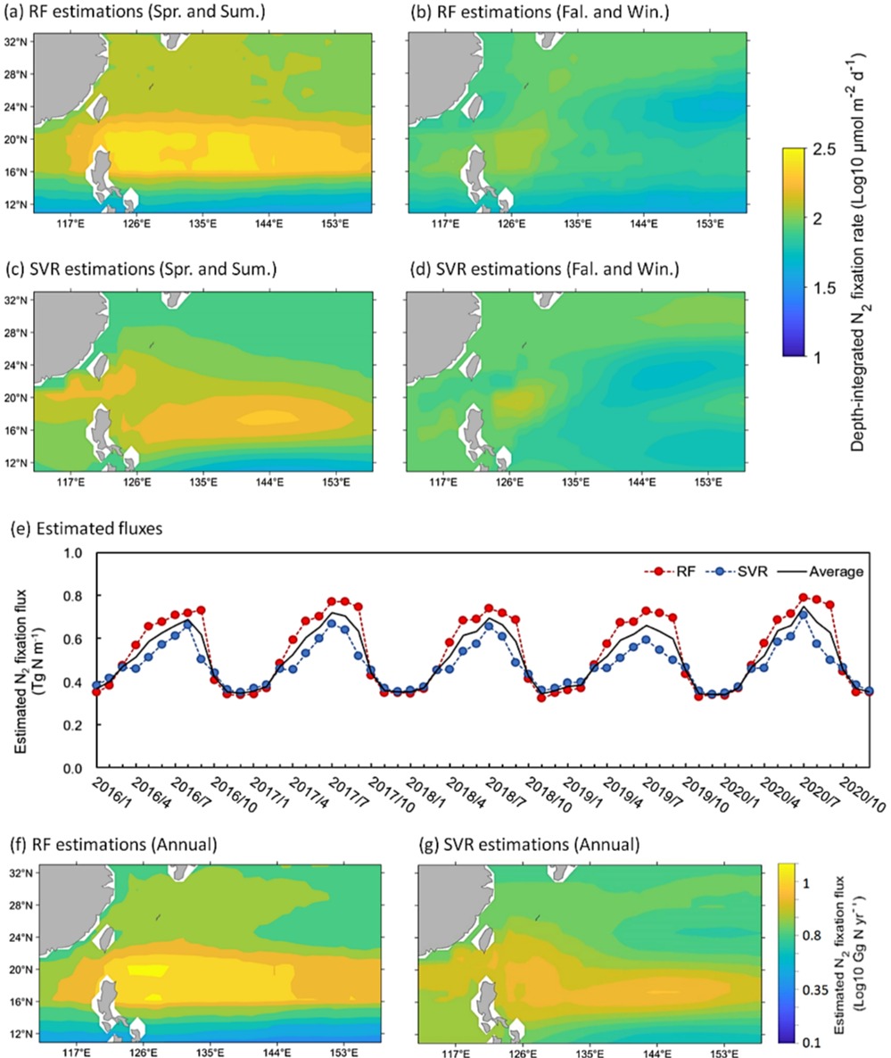 结合机器学习算法,对该区域固氮速率的连续时空分布格局进行了推演,实现了对观测结果的准确还原和有效扩展(图2)。基于此,估算得到(亚)热带西北太平洋的年固氮通量为5.72-6.45 Tg N yr-1,单位面积的固氮通量(5.72×10-7到6.45×10-7 Tg N km-2 yr-1)甚至高于已知的固氮热点海区,如热带北大西洋(3.36×10-7 Tg N km-2 yr-1)、北太平洋副热带流涡区东部(4.47×10-7 Tg N km-2 yr-1)和热带西南太平洋作比较(2.91×10-7 Tg N km-2 yr-1)。