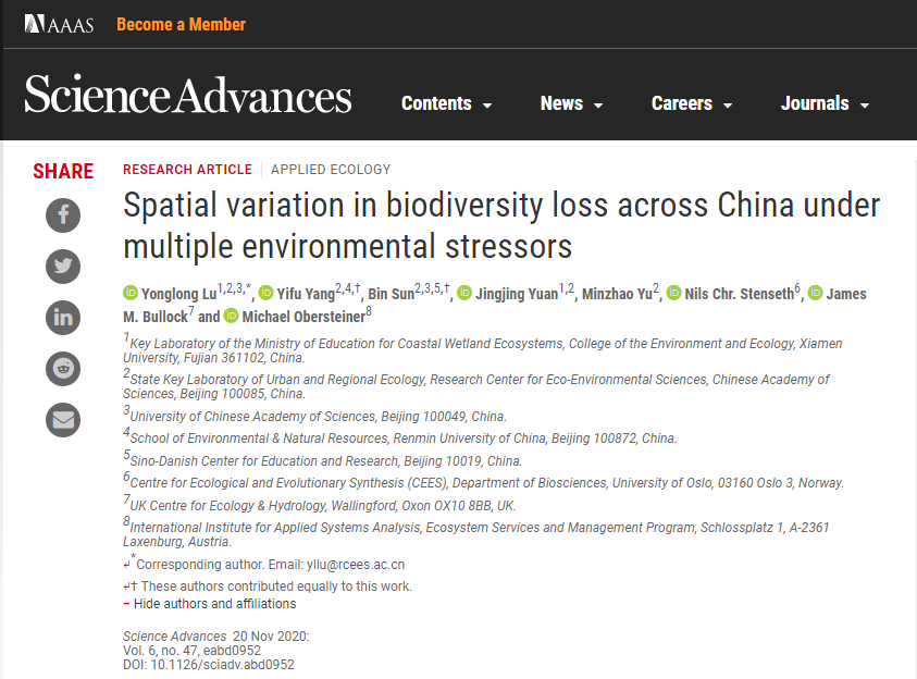 永利集团304am登录、中科院生态环境研究中心的吕永龙教授课题组与挪威、英国和奥地利科学家合作,在多种环境压力下中国生物多样性减少的空间变异方面取得重要进展。北京时间11月21日,相关成果以“Spatial variation in biodiversity loss across China under multiple environmental stressors”为题发表在国际著名期刊Science Advances上(2020,6(47):eabd0952)。