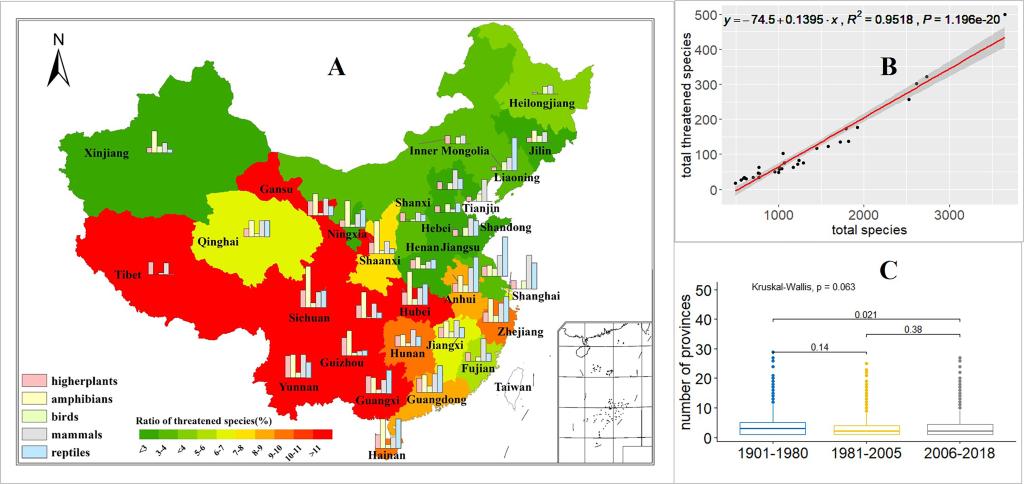 2020年是联合国生物多样性年。生物多样性对于维持生态系统健康和实现联合国可持续发展目标(SDGs)非常重要。中国生物多样性丰富,但也有大量濒危物种。从全球尺度看,中国南部是25个生物多样性热点地区之一。从全国尺度看,截至2018年底,中国共建立了2750个自然保护区,《中国生物多样性保护战略与行动计划(2011-2030)》确定的35个生物多样性保护重点区域基本覆盖了中国生物多样性保护的热点地区。日益加剧的环境变化给生物多样性保护带来多重压力,而且不同省份的地形、气候、人口、经济发展水平和外部压力来源各不相同,因此需要把生物多样性保护和社会经济发展相结合,以往很少有对多重环境压力下生物多样性保护的大尺度研究。