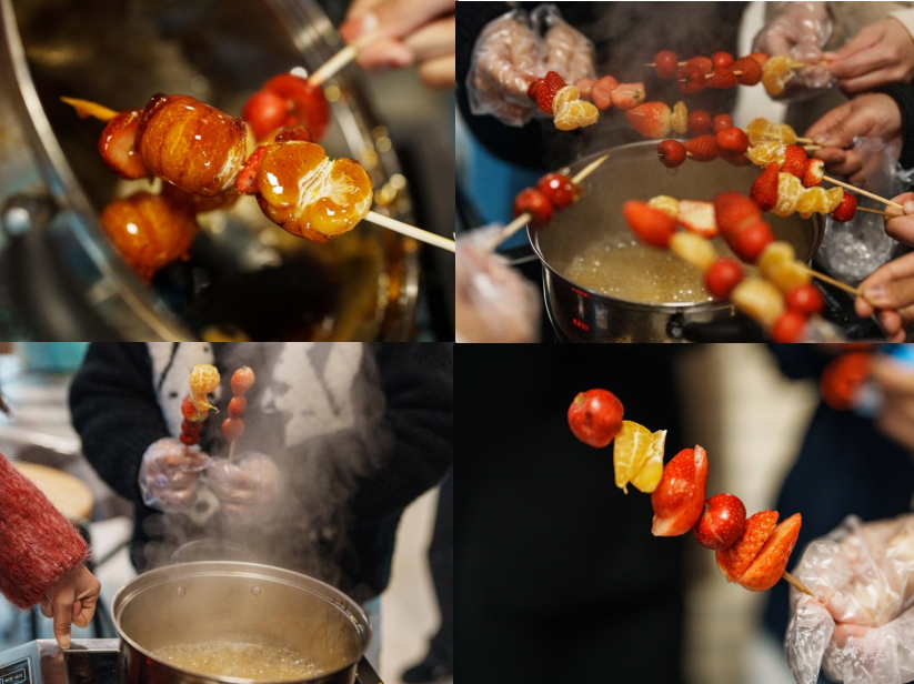 随着甜甜的糖浆香气弥漫在咖啡厅,橘子、草莓、山楂裹上香甜的糖衣,冬天的第一根糖葫芦完成啦!冰糖葫芦是北方著名传统小吃,早在宋朝便有记载,不仅承载着岁月的温润,也象征着团团圆圆、甜甜蜜蜜。酸甜喜乐,冬至欢愉。